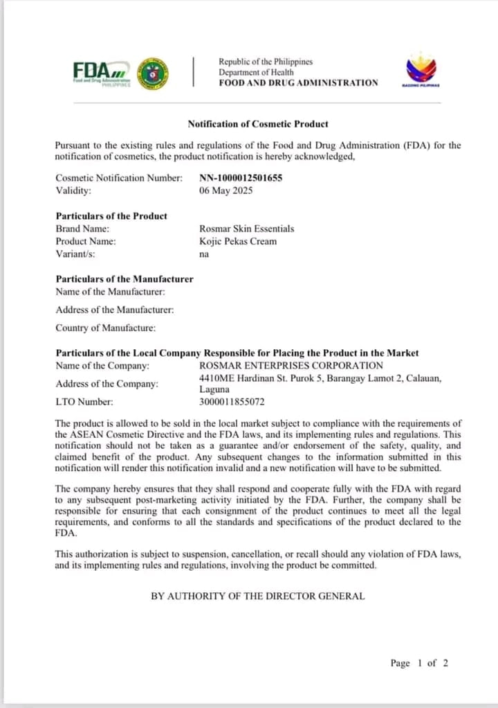 Paborito na ito ng marami dahil hindi lang siya epektibo, super bango pa! Hindi ka na mag-aalala sa hapdi, lagkit, o pamamalat! Siguradong gaganda at magiging blooming ang iyong kutis gamit ang bagong Rosmar Kojic Pekas Cream!